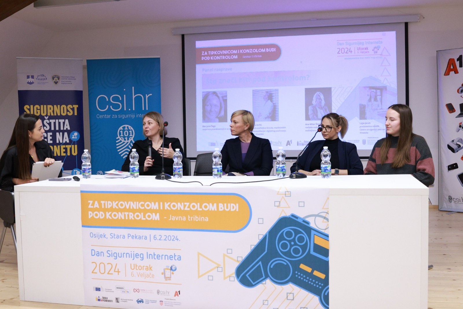 Javna tribina održana je 06. veljače 2024. godine u Staroj Pekari u Osijeku, a program se sastojao od kratkog uvodnog dijela u kojem su se sudionicima obratile Ana Veočić, djelatnica Centra za sigurniji internet, Marijana Šego, savjetnica pravobraniteljice za djecu, te Iva Ančić, rukovoditeljica brenda, marketinških komunikacija i digitalnog poslovanja, A1 Hrvatska.